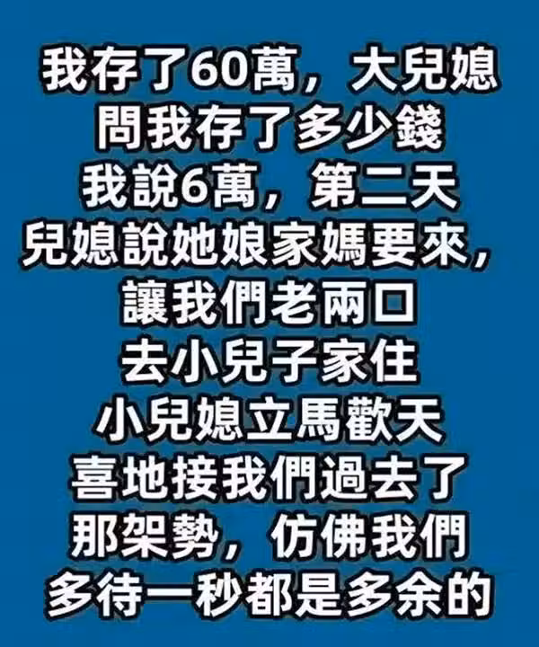 大兒媳突然話鋒一轉,看似不經意地問我:「媽,您和爸辛苦了一輩子,現在也該享享清福了,不知道你們存了多少錢呀?」我心裡 「咯噔」 一下,一種莫名的警惕感油然而生,這大兒媳平時就有些精明,突然問起存款,讓我心裡直犯嘀咕。