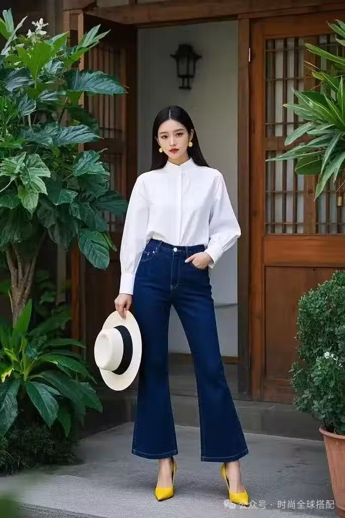 搭配深藍牛仔喇叭褲,