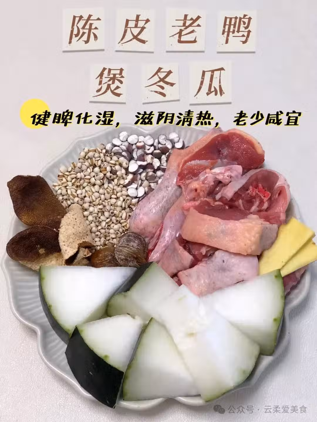 【食材準備】:陳皮10克,鴨肉500克,帶皮冬瓜500克,蜜棗1-2個,生薑2片,薏米50克