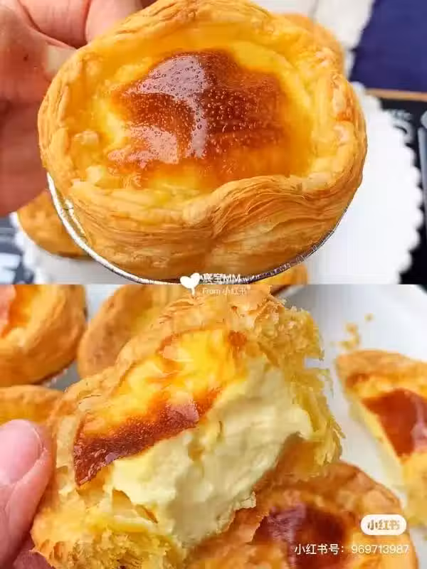 (三)烤箱預熱210度,蛋撻皮放入烤盤中倒入7-8分滿的蛋液,然後放入烤箱烤20分鐘即可