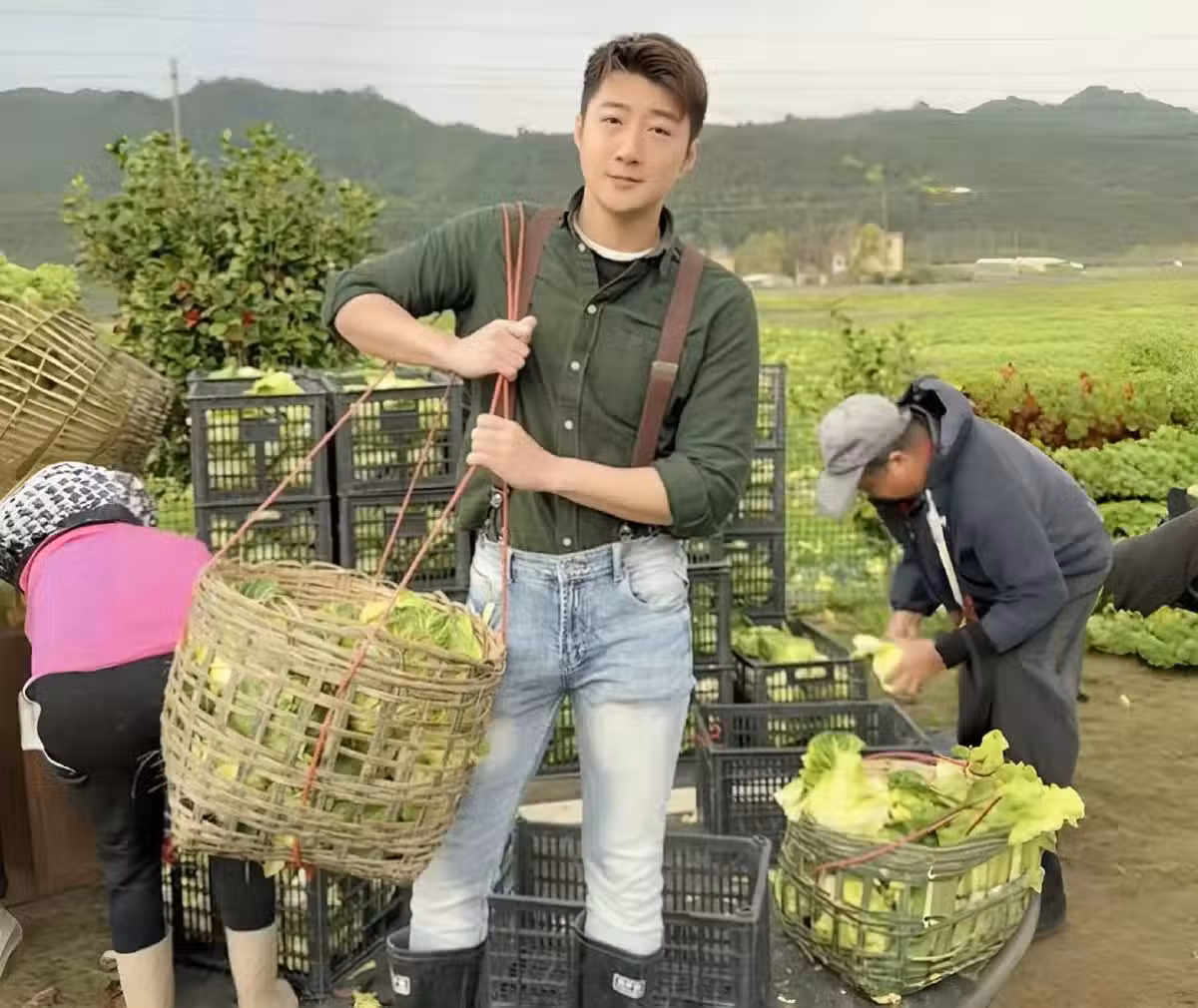 在視頻中可以看到,蔡淇俊即使到田裡去摘菜,也依舊打扮得相當帥氣。頭髮用髮蠟打理得一絲不苟,穿著軍綠色襯衣、淺色緊身牛仔褲,腳下換了一雙黑色筒靴。