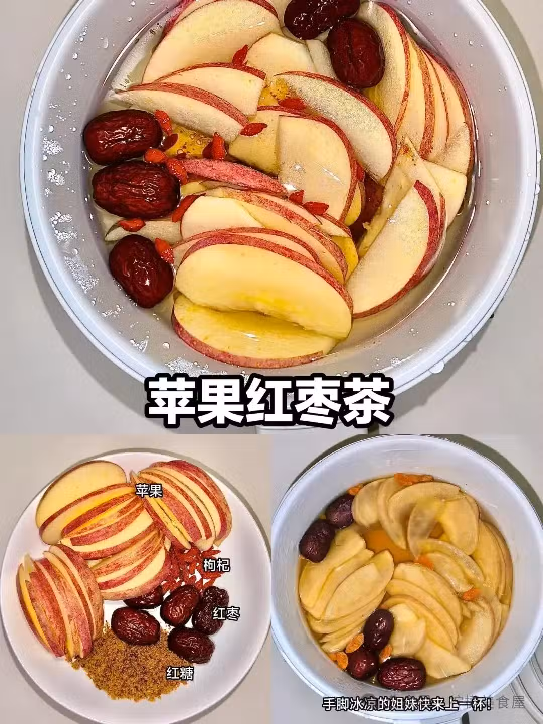 紅糖補血、暖胃生津、活血化瘀。煮蘋果水多加紅糖,特別適合手腳冰涼的姐妹喝。 不瞞大家,早餐我也喜歡煮這款蘋果水,再搭配片麵包吃,真的太滿足了。一餐養生早餐輕鬆搞定。 經常熬夜、長期手腳冰涼、臉色臘黃的姐妹,可以試試哦! 食材: 蘋果、枸杞、紅棗、紅糖 做法: 1、蘋果用鹽搓洗乾淨,去核切塊。 2、所有食材放到鍋里,加入500ml水小火煮半小時即可。