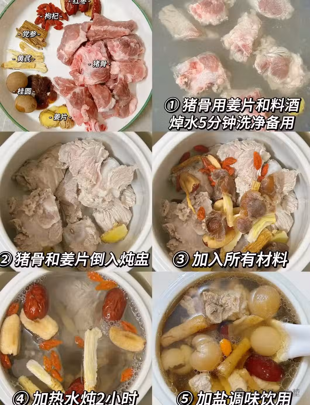 將焯水後的豬骨和薑片放入燉鍋中,加入桂圓、黨參、黃芪、紅棗和枸杞。倒入足夠的清水,水量需沒過所有食材。 大火燒開後撇去浮沫,轉小火慢燉1.5-2小時。最後放入枸杞,煮3-5分鐘即可出鍋。