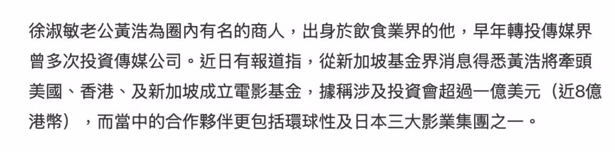 因為是從外界獲悉的消息,所以就有港媒諮詢了黃浩。黃浩對此並沒有否認,他直言不諱地表示想要支持香港電影,因為自己是在香港出生,所以很想為香港電影出一份力,而且並不擔心投資失敗,更稱投資電影就當成是投資買股票或是買房子,而如今是香港電影市場的低位(寒冬),競爭少了反而更好入市發展,此外他還表示會參與其中一套電影劇本的策劃。言下之意投資8億進軍電影業就是真的,說明黃浩已經東山再起,個人事業又重回巔峰,而徐淑敏的闊太太生活又穩了。