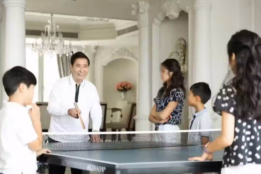 有李兆基陪著孫子孫女打桌球的照片,一共 4 個孩子,應該是徐子淇的四個兒女,從照片來看,兩個女兒梳著公主頭,個子很高,身材苗條,氣質出眾,臉型都遺傳了媽媽徐子淇,已經出落的亭亭玉立了,很有大家閨秀的范兒。