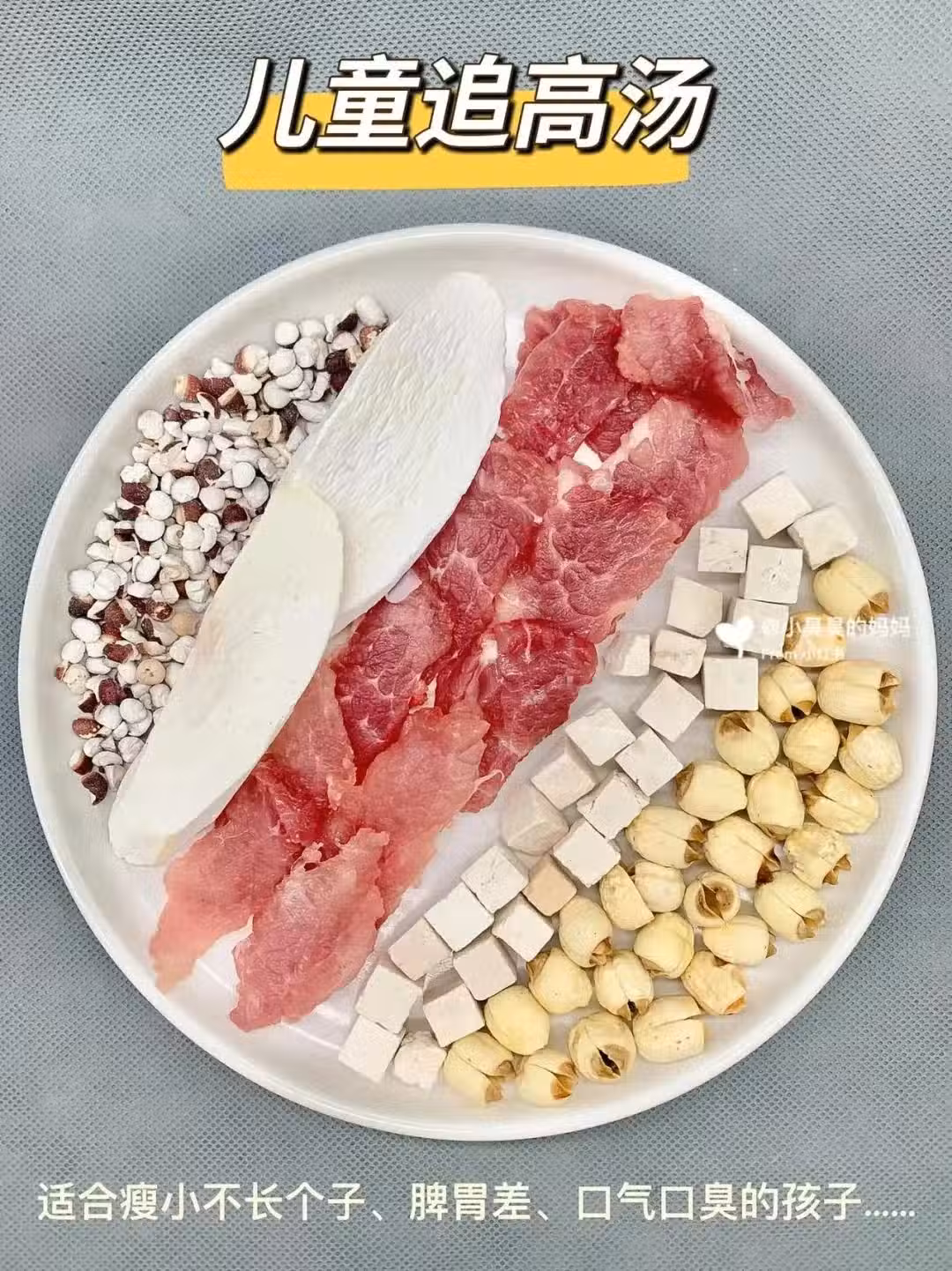 這道湯源自宋代《太平惠民和劑局方》中的健脾古方,山藥補脾養胃,茯苓利水滲濕,蓮子清心安神,芡實固腎益精。搭配瘦肉燉煮,湯清味甘,特別適合脾胃虛弱、消化不良的孩子。春季濕氣重,這道湯既能祛濕健脾,又能增強體質,是孩子長高的基礎保障。