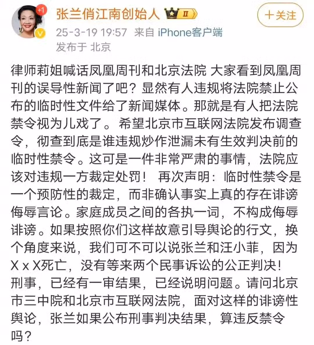 今天還發生了一件事,某家媒體公布了張蘭和汪小菲臨時性禁令,內容就是禁止他們繼續誹謗大S,對於這個消息,張蘭也非常氣憤,她發文怒懟:到底是誰將法院禁止公布的臨時性文件交給了媒體?有人視法院禁令為兒戲,如果這樣的話,那麼我們可不可以說張蘭和汪小菲,因為某某死亡,沒有等來兩個民事訴訟的公正判決!