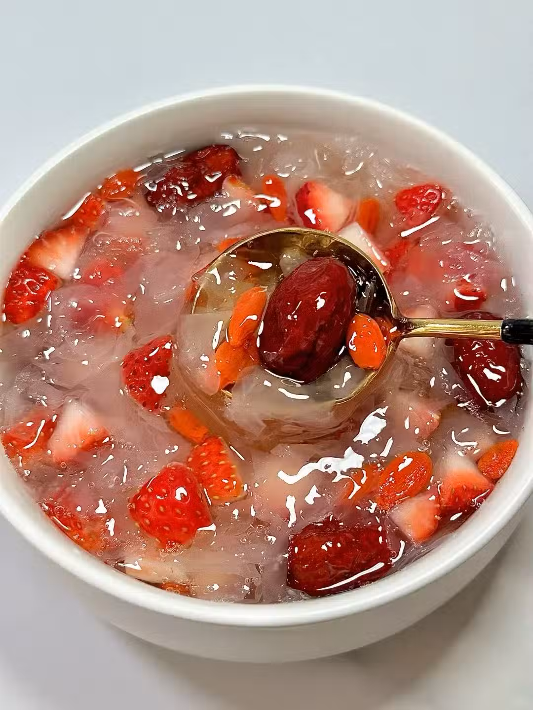 春燥漸起,肌膚干癢、喉嚨微啞?一碗粉嫩清甜的「草莓銀耳羹」,不僅顏值爆表,更是潤燥養顏的天然滋補品!傳統銀耳與鮮果草莓的奇妙碰撞,解鎖初春養生新方式。,草莓銀耳羹是一道營養豐富且口感極佳的甜品,草莓銀耳羹的主要食材包括草莓和銀耳。草莓富含維生素C、維生素A、果膠和膳食纖維等營養物質,這些成分具有抗氧化、抗衰老、保護心血管、促進消化等多種作用。銀耳則富含膠質、多種維生素和17種胺基酸,具有滋陰、潤肺、養胃、生津、益氣、補腦、強心等多種功效。當草莓與銀耳相結合製作成羹時,不僅保留了兩者原有的營養成分,還使得口感更加豐富和美味。銀耳具有滋陰潤肺的功效,可溶性膳食纖維有助於調節腸道功能,預防便秘,促進消化對於改善呼吸道健康、緩解咳嗽等症狀,草莓中的維生素C和銀耳中的膠質都具有美容養顏的作用,能夠滋潤皮膚、去除黃褐斑,使皮膚更加細膩光滑。草莓和銀耳都含有豐富的營養物質,能夠增強人體的免疫力,提高身體抵抗力。 做法超簡單:銀耳泡發剪碎,小火慢燉出膠後,加入冰糖與新鮮草莓燜煮3分鐘,撒上枸杞點綴。膠質濃稠如燕窩,果香沁人心脾,冷熱皆宜!