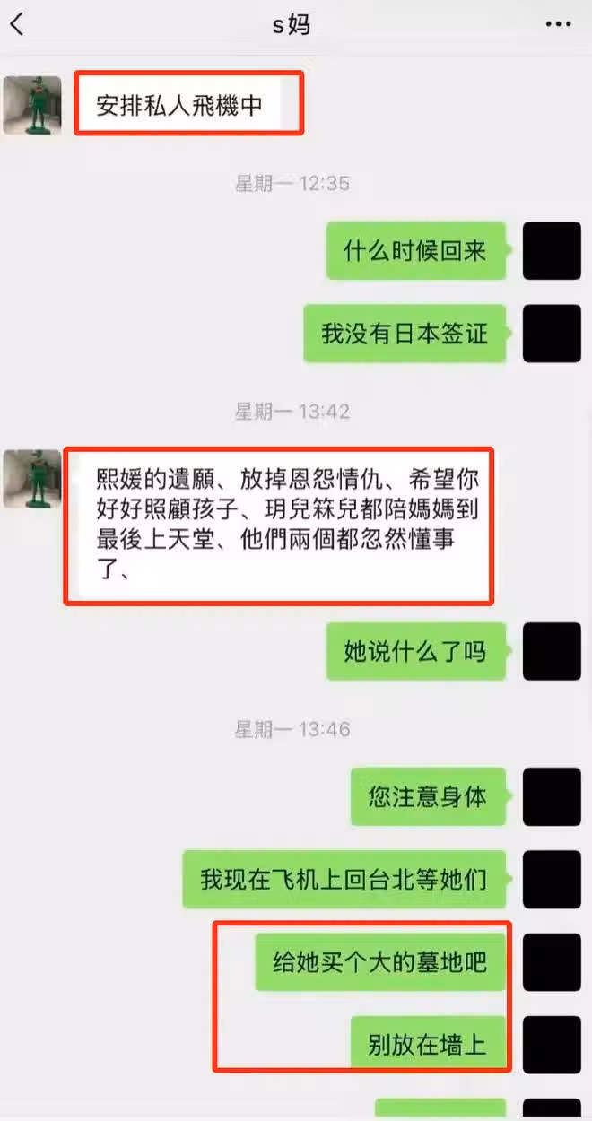 S媽在回覆中表示,安排私人飛機中,汪小菲說自己沒有日本簽證,言下之意是本來想去日本見最後一面,然後S媽說出了大S的遺願,稱放掉恩怨情仇,希望你好好照顧好孩子,子女都陪媽媽到最後上天堂,他們兩個都忽然懂事了。讓汪小菲追問大S有沒有再交代什麼,S媽沒有回應,汪小菲表示自己想給大S買一塊大墓地,別放在牆上,S媽也沒回應。