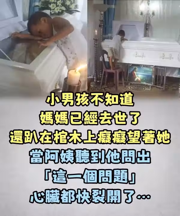 小男孩不知道媽媽已經去世,還趴在棺木上痴望著她,當阿姨聽到他問出「這一個問題」心臟都快裂開了…