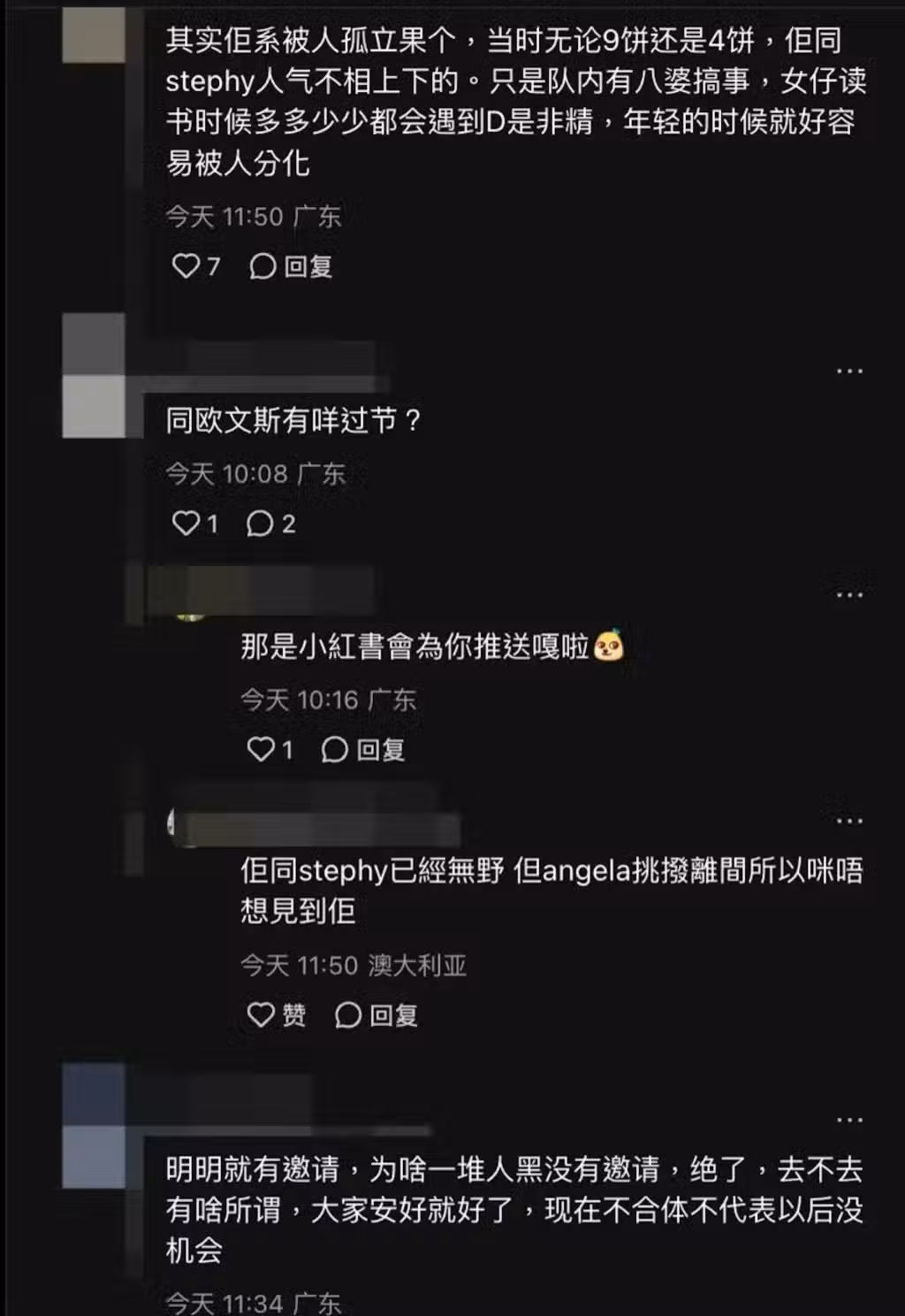 其後有網民在社交平台詳細列出鄧麗欣和傅穎不和事件始末,將矛頭直指隊中有「茶水間KOL」之稱的成員區文詩身上。暗指她當年曾在鄧麗欣和傅穎之間挑撥離間,甚至玩孤立、造謠,玩小圈子,導致兩位昔日的最好朋友,變成最熟悉的陌生人。就連傅穎早幾年和楊愛瑾吃了餐飯,該成員都立即取消關注楊愛瑾,所以傅穎沒有歸隊都是可理解。