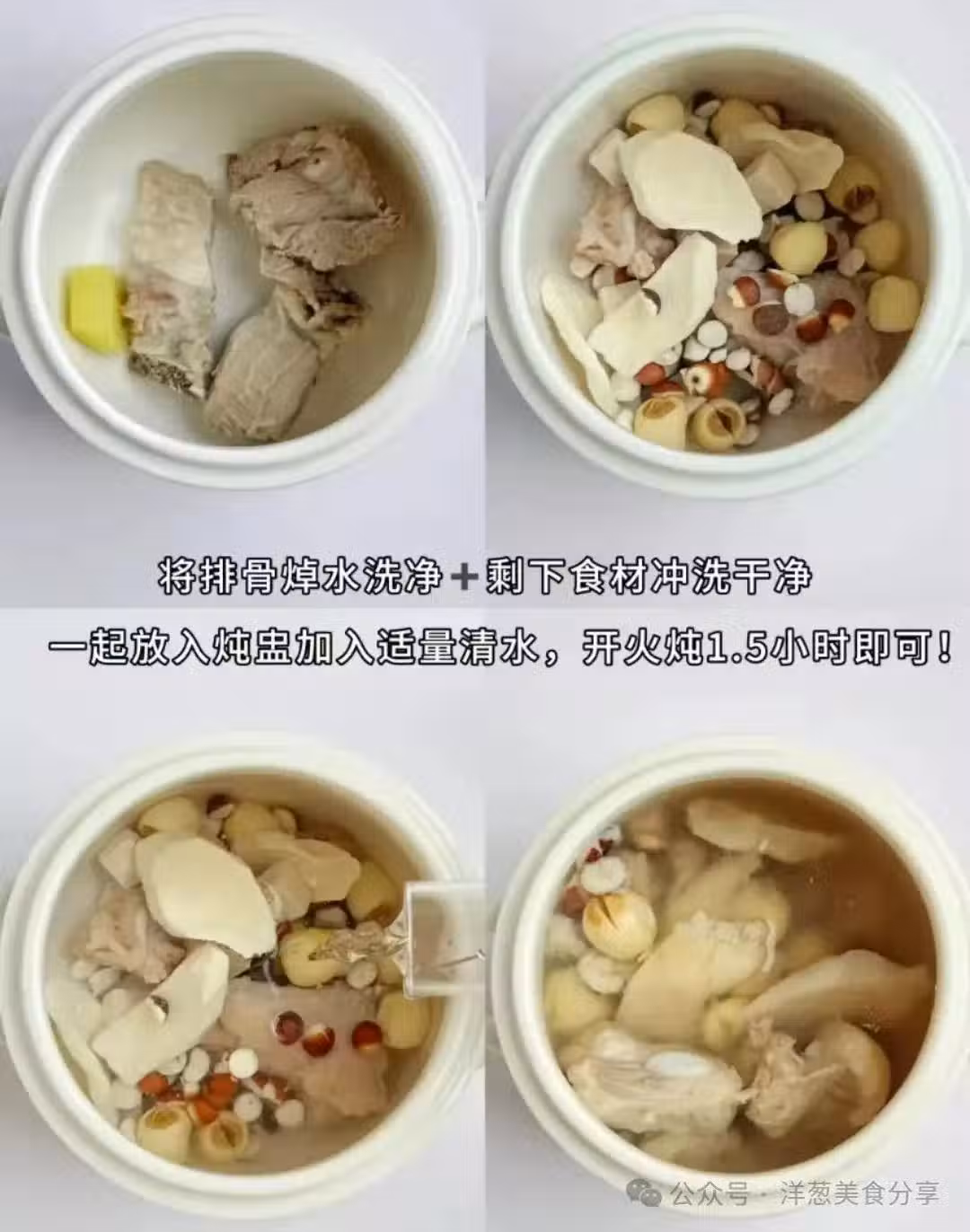 將排骨焯水洗凈+剩下食材沖洗乾淨,一起放入燉盅加入適量清水,開火燉1.5小時即可!