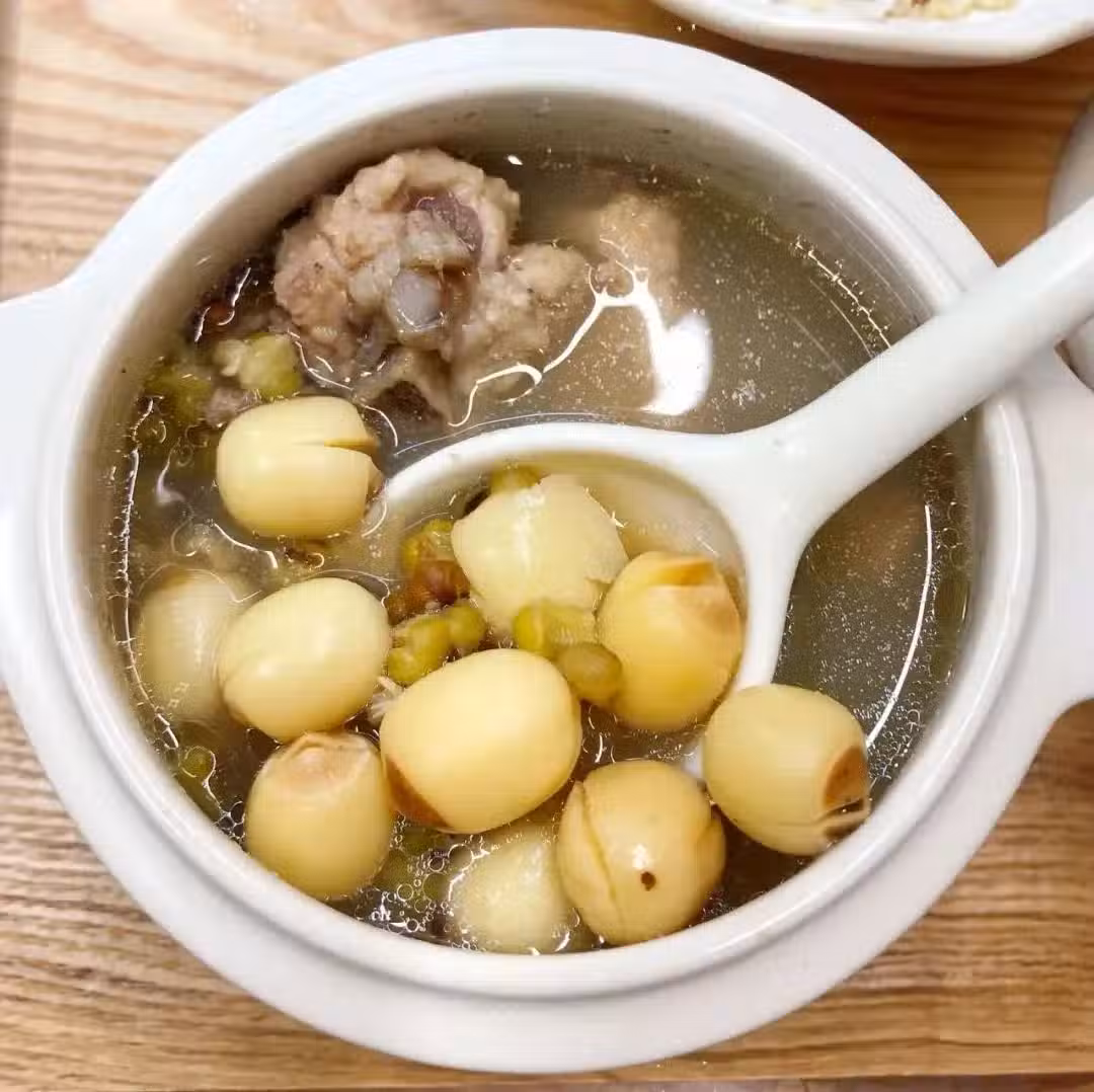 3. 山藥、排骨、浸泡好的綠豆和蓮子一起放入燉鍋里,加入足夠的水,隔水燉 1.5 個小時。最後加一點鹽調味,就可以出鍋啦!