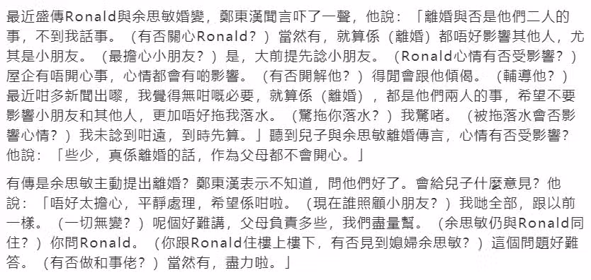 但鄭東漢從側面證實了,鄭中基與余思敏的婚姻的確出現問題,「我有關心他,有空會找他聊天。我希望就算真的(離婚),也不要影響小朋友。」