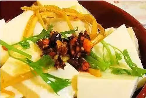 2、冷卻的豆腐切成小塊,放入調味汁,拌入紅油金針菇,撒上鮮菜末即可。