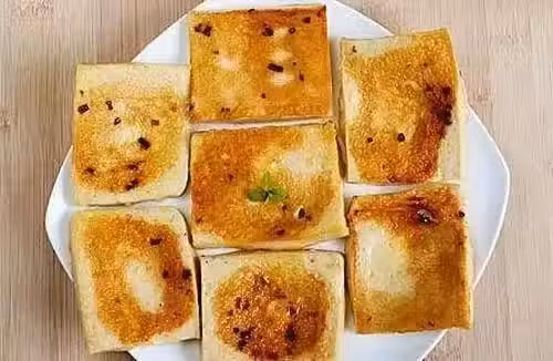 7、煎至底部金黃、豆腐鼓起變厚邊緣上翹後翻面,煎至兩面金黃色盛出即可。