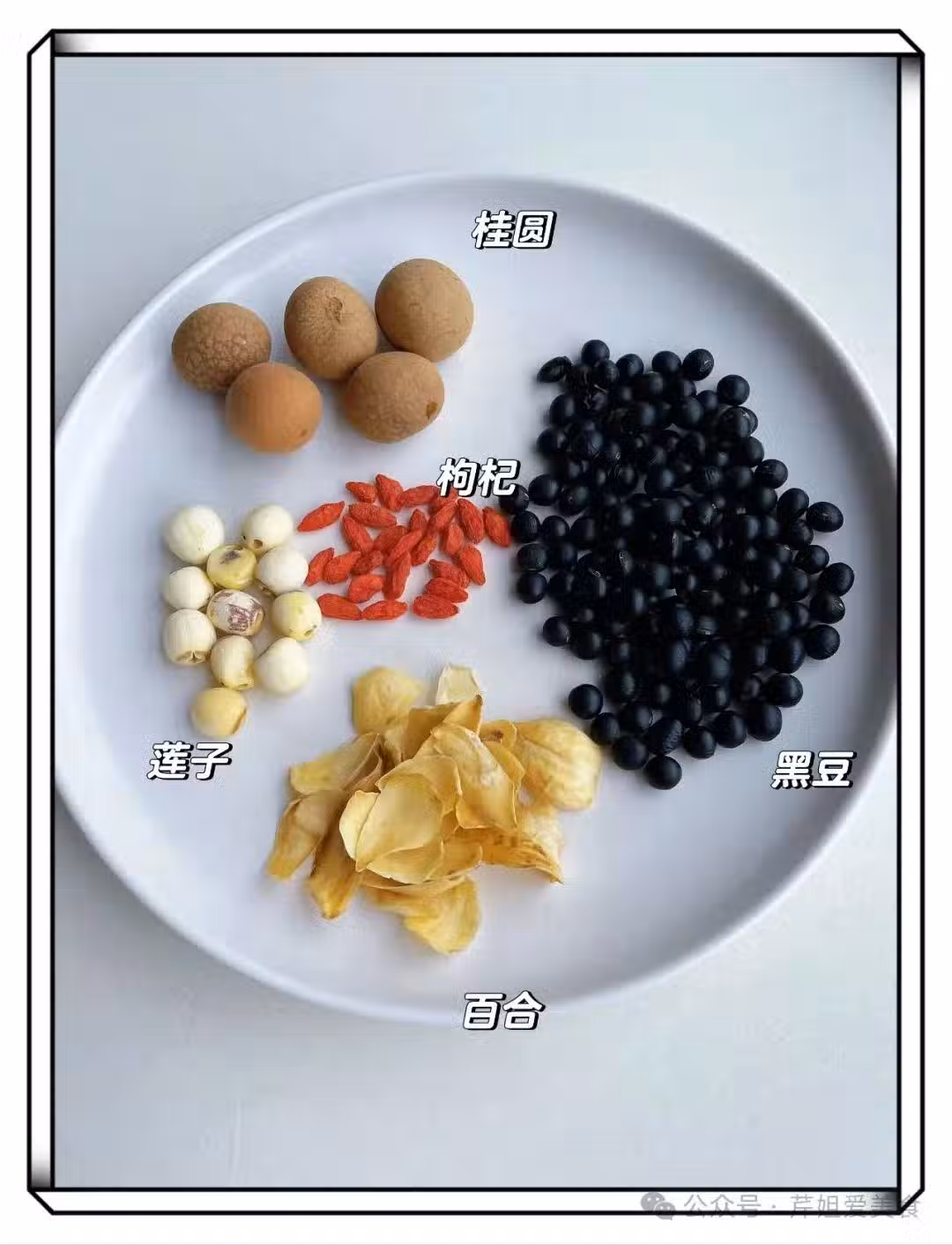 桂圓乾5~10顆(捏開,連殼帶核煮)蓮子10顆,黑豆一小把,百合10克,枸杞5克