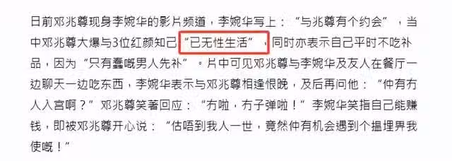採訪中,鄧兆尊表示自己與三位女友已經沒有性生活,同時還表示自己在日常生活中不會吃補品。--------------------------------