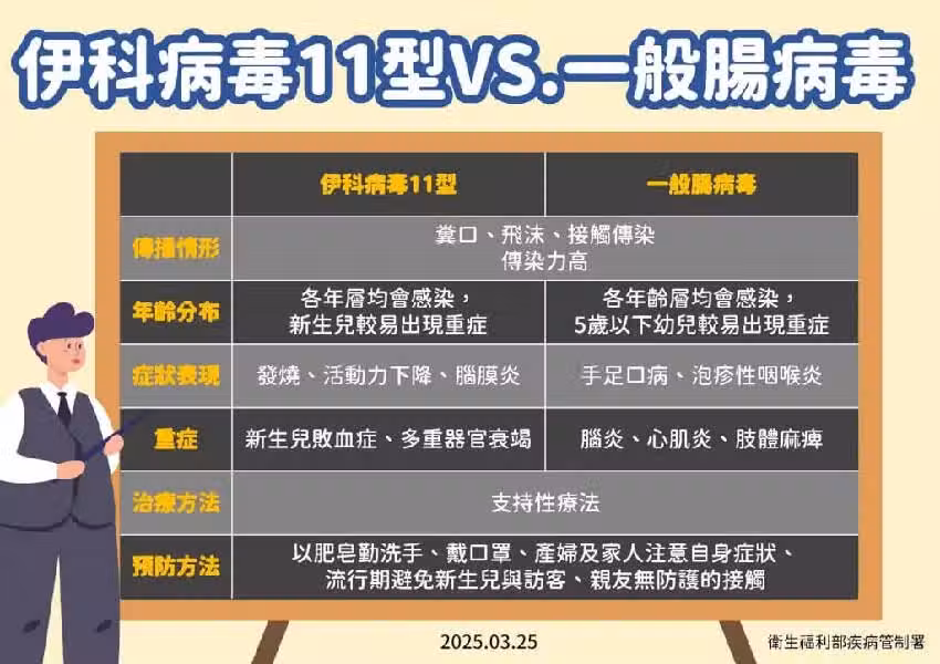 「伊科病毒11型」為腸病毒中的一種,不過和一般腸病毒不同,不會引起大家熟知的皰疹性咽峽炎或手足口病,成人或年紀較大的小孩感染症狀也並不明顯。