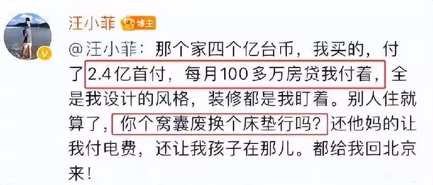 不過甭管離婚多久,汪小菲還是蠻放不下的,退一步沒有海闊天空,而是越想越氣,這不隨後就發文,說每月房貸自己付,具俊曄「拎包入住」啥也不管就算了,就連床墊都不捨得換一個。