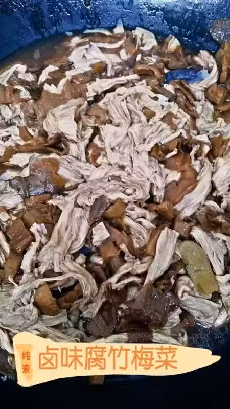 材料: 濕腐竹 1kg(或豆包)、咸梅菜 1包(洗凈切碎後用沸水煮10分鐘去咸和去雜質,撈出備用)、薑片 8片、 鹵包 2小包、黑醬油 1湯匙、齋湯醬 1茶匙、素調味粉 1茶匙、清水 2000ml