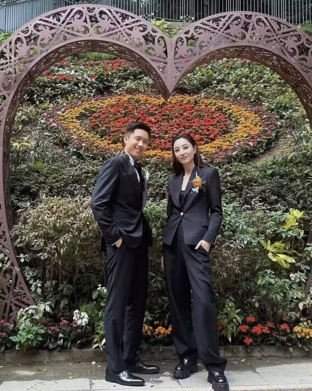 鄭希怡的弟弟高大帥氣,穿了一身黑色新郎服。