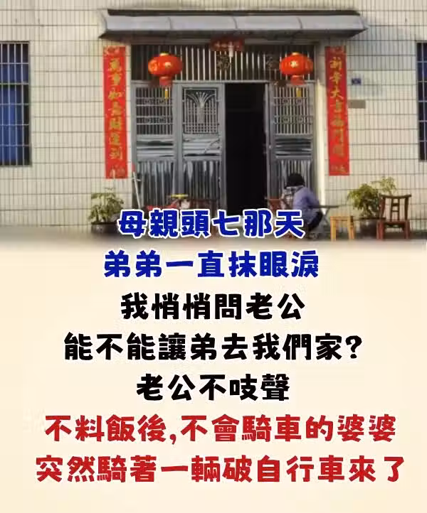 母親頭七,弟弟一直抹眼淚,我悄悄問老公,能不能讓弟去我們家?老公不吱聲,不料飯後,不會騎車的婆婆突然騎著一輛破自行車來了