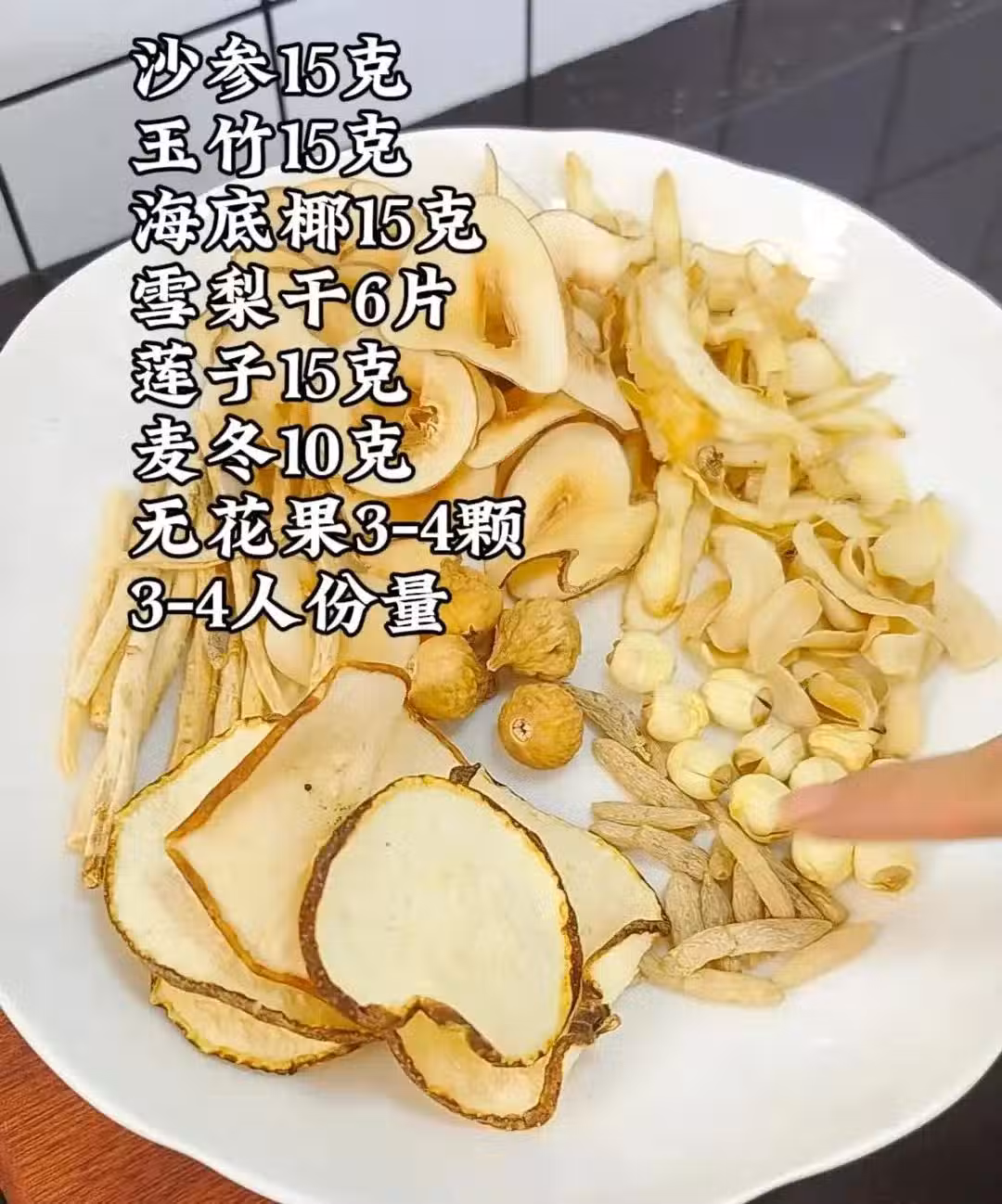 熬夜追劇的螢幕黨、換季易感冒的敏感星人、孕期哺乳期需要溫和滋補的准媽媽、健身控糖又想美容的養生達人。這沙參玉竹海底椰雪梨乾蓮子麥冬無花果水具有滋陰潤肺、益胃生津、清熱解毒、養顏護膚等多種作用。它適用於陰虛內熱、睡不好、心氣煩躁等人群,同時也有助於改善消化不良、食欲不振等。沙參:有潤肺滋陰,益肺氣,補而不膩、玉竹:可滋陰潤燥,生津止渴、海底椰:可改善睡眠質量,緩解煩躁情緒,同時能夠滋潤肺部,緩解咳嗽,無花果:能夠緩解體內熱邪引起的不適症狀,如口舌生瘡、咽喉腫痛等,同時有助於潤腸通便,保持腸道健康。口乾舌燥、口渴等症狀,同時有助於潤肺清心,保持心情愉悅。沙參玉竹海底椰雪梨乾蓮子麥冬無花果水是一道具有多種健康功效的養生飲品,其功效主要得益於各原料的協同。清熱解毒:海底椰和雪梨乾可幫助清除體內熱邪,緩解口舌生瘡、咽喉腫痛等不適 。 養心安神:此湯對心陰不足、心神不寧引起的心悸不安、失眠多夢等有一定改善作用,幫助舒緩情緒、促進睡眠。