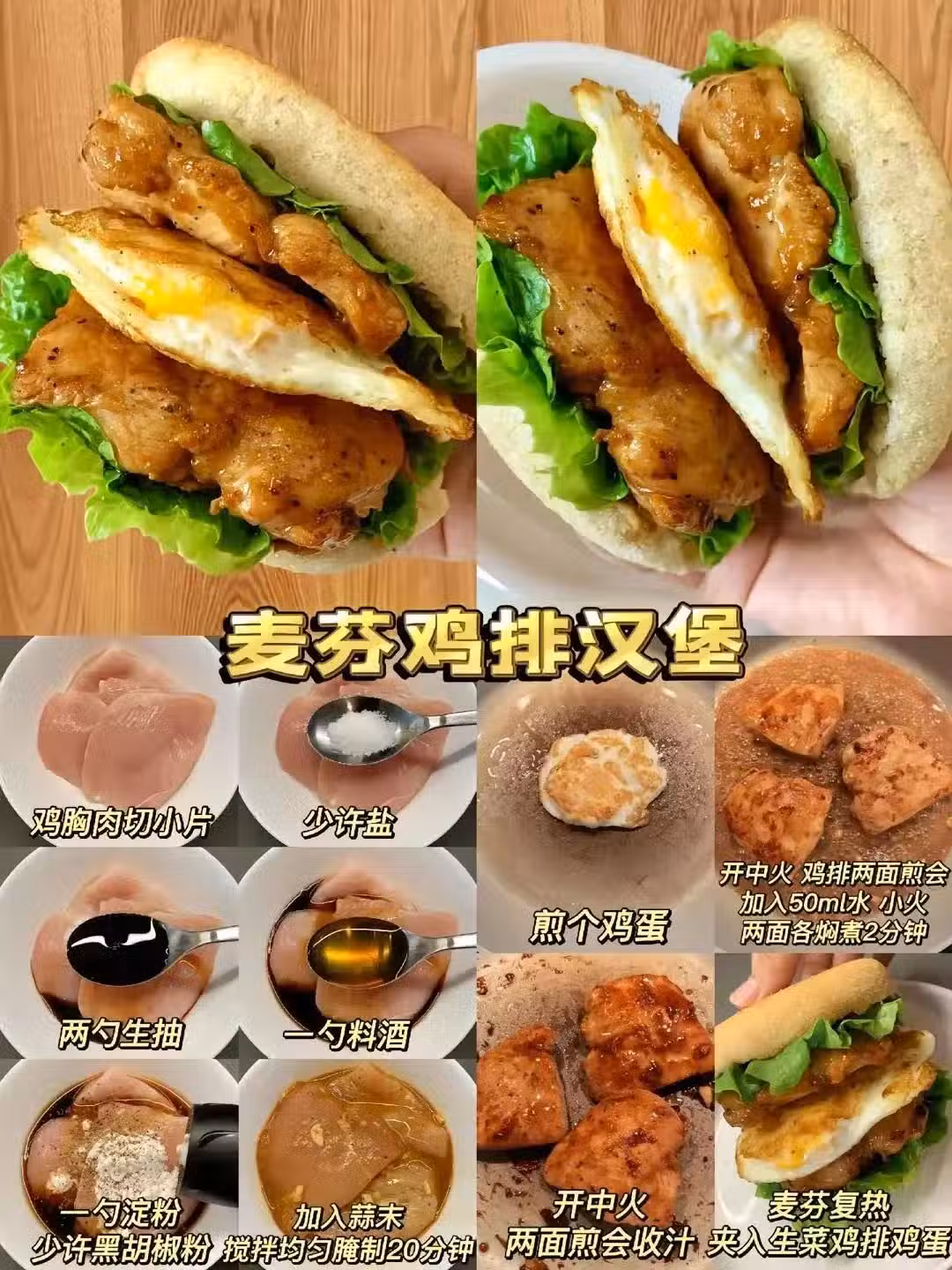 麥噹噹野生周邊DIY。雞胸肉,防毒秘制腌料腌制20分鐘,煎到兩面金黃,麥芬麵包切開塞生菜番茄,擠黃芥末醬時請幻想自己在拍美食慢鏡頭。