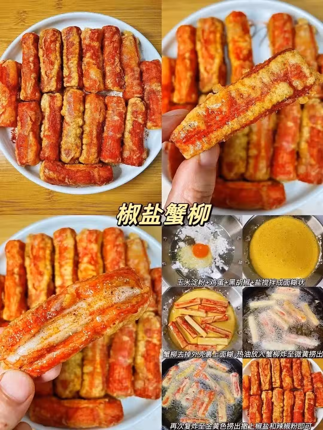 蟹柳棒拆絲裹雞蛋澱粉油炸,出鍋前撒椒鹽辣椒麵抖三抖,酥脆得能聽見ASMR音效。