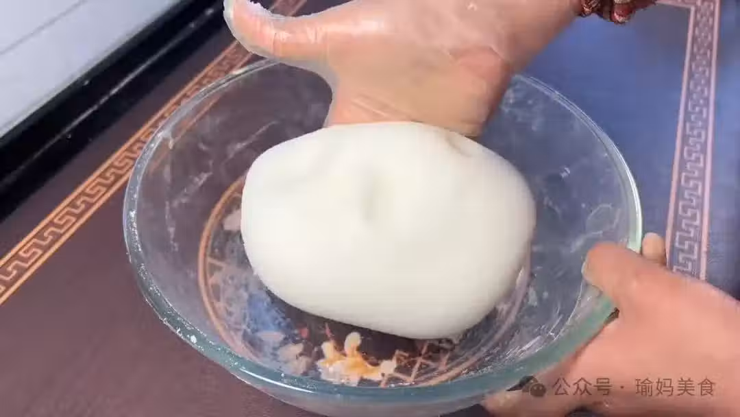 我們取出糯米糰放在揉面墊上,用手攤開,再加上澱粉團。將兩種麵糰充分揉勻,加入小麥澱粉是青團不塌陷的關鍵,吃起來也不粘牙