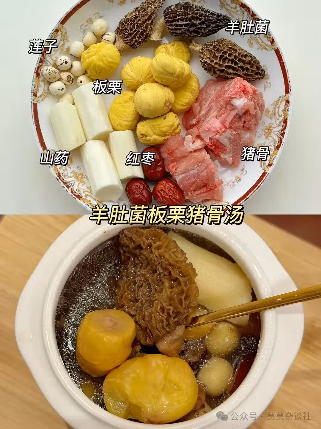 做法: 羊肚菌提前泡發洗凈;板栗去殼;豬骨焯水。一起燉1.5小時,香氣四溢!