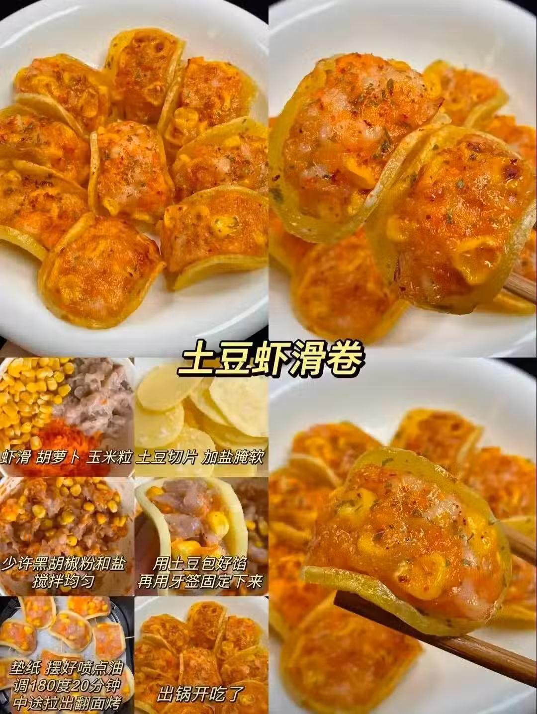 土豆蝦滑卷:碳水與蛋白質的陰謀聯姻,土豆切片,加鹽腌軟,蝦滑擠成長條,用土豆片包裹。