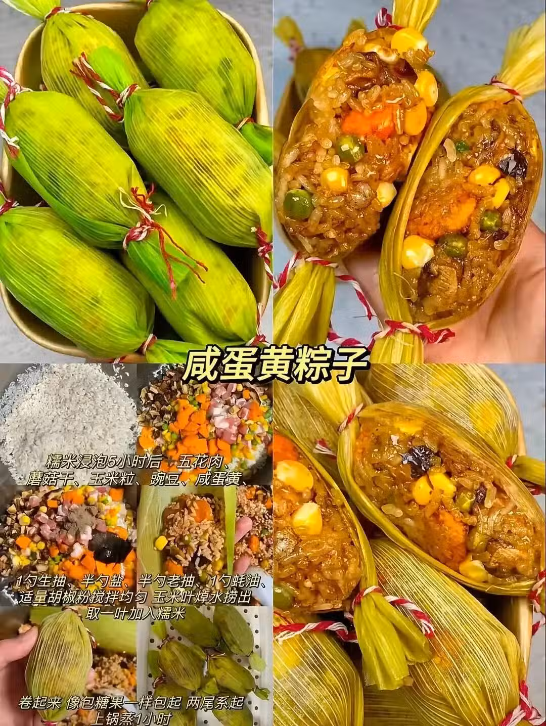 鹹蛋黃玉米葉粽子:端午節叛逃計劃,新鮮玉米葉當容器,糯米飯混入鹹蛋黃碎和玉米粒,上鍋蒸1小時。 打開瞬間咸香混著玉米清甜直衝天靈蓋,屈原吃了都想改投現代農業。