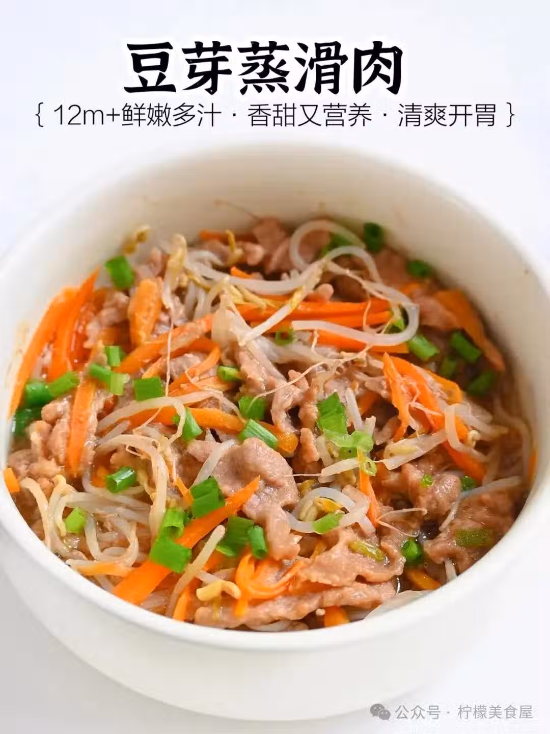 「春吃芽,夏吃瓜」,春天就要給孩子多吃芽菜,豆芽清熱解毒。胡蘿蔔清肝明目。瘦肉促進發育,改善貧血。三者搭配在一起,做出來的蒸菜,營養豐富。 我家這幾天,也在做這款蒸菜,味道真的很不錯,小孩子喜歡吃,我也喜歡吃,幾塊錢做一大盆。家裡有孩子的,春天多做來吃哦! 食材: 豬肉片、胡蘿蔔絲、蚝油、醬油、松茸粉、澱粉、輔食油 做法: 1、綠豆芽清洗乾淨,胡蘿蔔去皮清洗乾淨切絲,豬肉清洗乾淨切片。大蒜去皮清洗乾淨,蔥花清洗乾淨切斷。 2、豬肉片放到碗里,加蚝油、醬油、松茸粉、澱粉、輔食油,抓均勻腌制15分鐘。 3、拿出一個碗,碗里舖上豆芽、胡蘿蔔絲,再鋪上腌制好的肉片,上鍋蒸10分鐘左右即可。