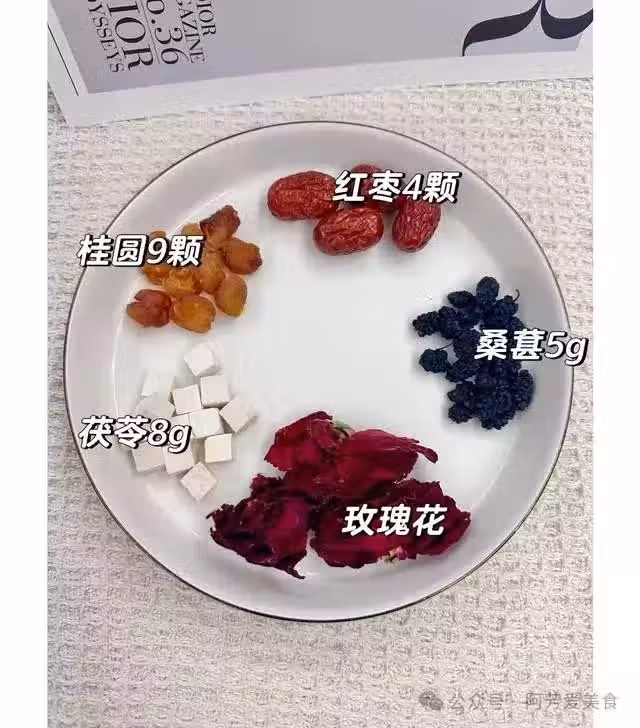 砂鍋倒三碗冷水,先放桂圓殼煮到水泛琥珀色,再加果肉、紅棗、桑葚和茯苓,小火咕嘟二十分鐘。 最後撒幾朵干玫瑰花,燜五分鐘就關火。