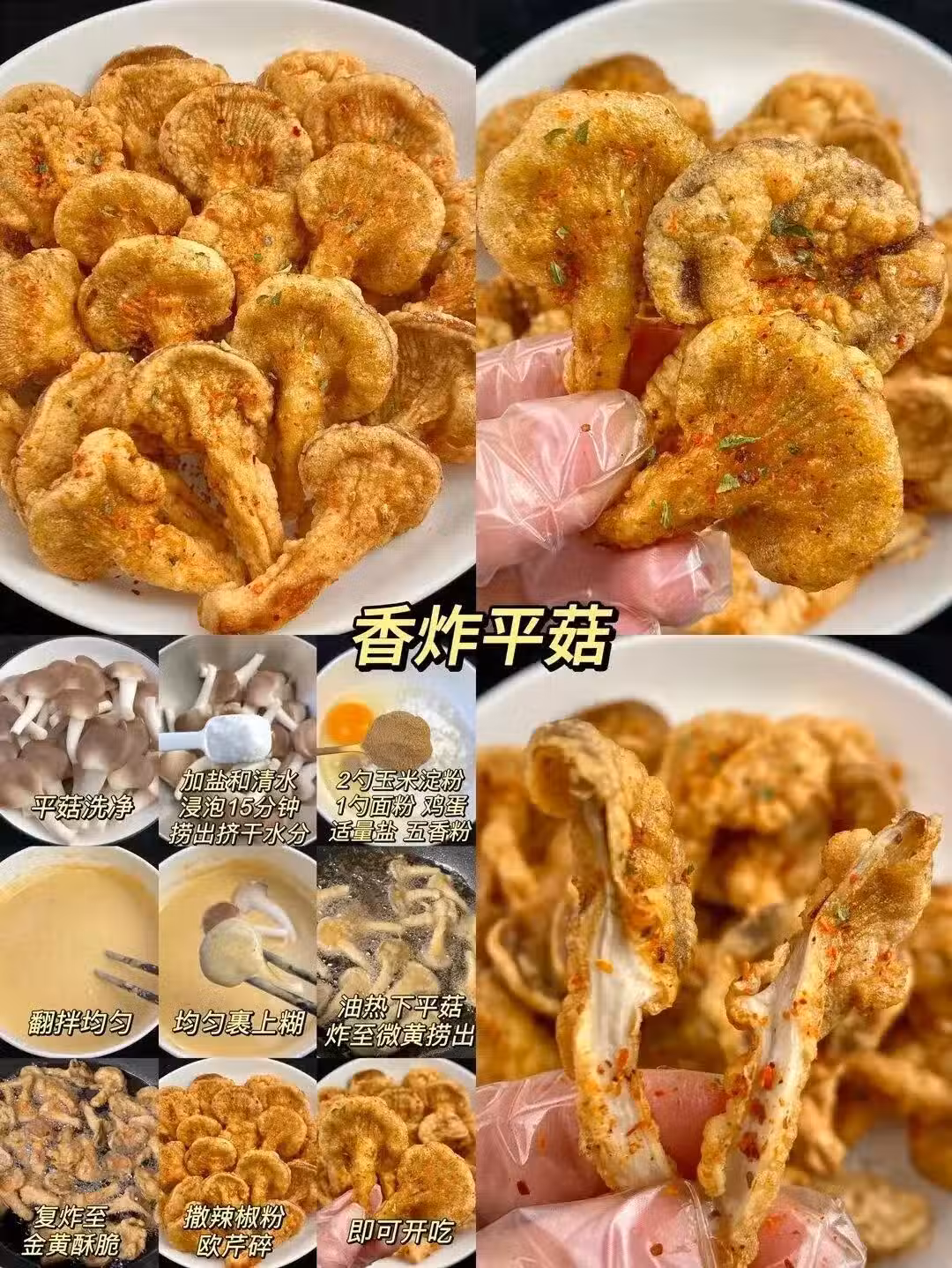 香炸平菇:素菜偽裝成肉的天才,平菇撕成條裹糊炸,出鍋撒椒鹽,酥脆程度堪比薯片,嚼著還有肉的口感! 建議配劇食用,但請注意:很可能劇追完了,平菇也沒了(別問誰吃的)。 脆皮香菇