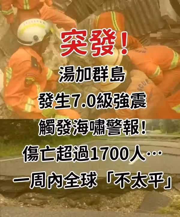 突發!!! 湯加群島發生7.0級強震,觸發海嘯警報!傷亡超過1700人…一周內,全球「不太平」!!!