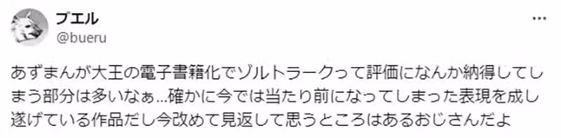 「我是第一次看《笑園漫畫大王》的原作漫畫,卻有種非常熟悉的感覺。該說是以前看過的動畫帶來的懷舊感嗎?還是《Manga Time Kirara》系作品的Zoltraak感呢?我也說不清。」