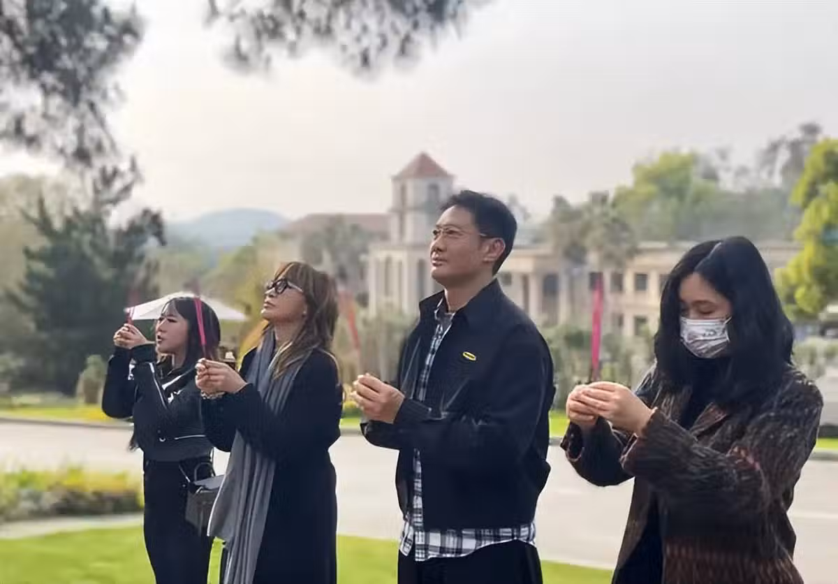 在李玟的墓碑邊上放好鮮花之後,二姐(李思林)隨即和一眾親人燒香祭拜,大家舉香默默站立在李玟墓前,似乎和李玟對話著。