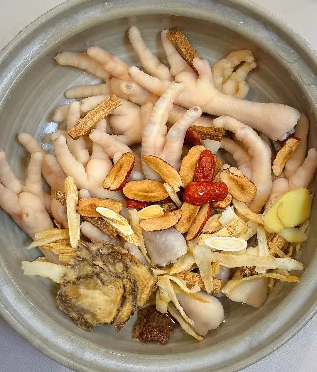 血氣不足的姐妹,姨媽走後都很適合喝這個,雞腳當歸黨參黃芪玉竹紅棗枸杞湯融合了多種食材的營養成分,具有多種滋補功效。當歸被譽為「補血第一藥」,具有補血活血、調經止痛的功效。黨參和黃芪都是補氣藥材,黨參能補益脾胃、潤肺生津,黃芪則能補氣固表,提高機體免疫功能。紅棗富含維生素C和鐵元素,能夠健脾胃、補氣血,改善面色蒼白、手腳冰涼等問題,玉竹具有養陰潤燥、生津止渴的功效,對肺胃陰傷、燥熱咳嗽等症狀有很好的緩解作用。枸杞也能滋補肝腎之陰,改善陰虛火旺導致的頭暈目眩、腰膝酸軟等、雞腳富含膠原蛋白和多種礦物質,有助於改善皮膚彈性,減少皺紋,使皮膚更加光滑細膩。紅棗和枸杞中的抗氧化物質能清除自由基,延緩衰老,保持肌膚年輕態、當歸是調理月經的良藥,能活血調經,緩解痛經、月經不調等問題。黃芪能提高機體免疫功能,增強抵抗力,預防感冒等疾病。枸杞中的多種營養成分也能提高免疫力,增強身體抗病能力,雞腳當歸黨參黃芪玉竹紅棗枸杞湯是一道營養豐富、滋補功效顯著的湯品。它不僅能補氣養血、滋陰潤燥、美容養顏,還能調理月經、增強免疫力、促進消化和安神助眠。然而,每個人的體質和健康狀況不同,在食用前最好諮詢專業醫生或營養師的建議,以確保其適合個人體質和需求。 食材功效:雞腳、當歸、黨參、黃芪、玉竹、紅棗、枸杞,做法: 雞腳冷水下鍋焯水,洗凈剪去腳甲,紅棗去核後不易上火,所有材料洗凈一併洗凈放進湯鍋里,加入適量清水,大火燒開轉小火煲40分鐘,撒上枸杞,出鍋前按個人喜好調味即可