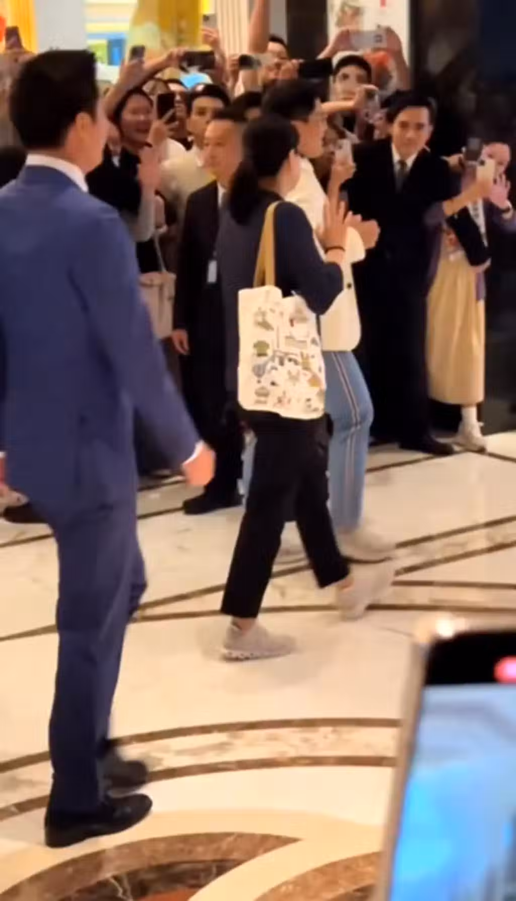 郭晶晶跟在霍啟剛身後,她是陪同霍啟剛出席活動,沒有喧賓奪主。當天她的打扮也很休閒,穿了黑色的開衫,黑色的褲子,一身很素樸的樣子,手上還拿了一個玩偶,應該是路人送給她的禮物。郭晶晶當天還背了一個白色的帆布包,裡面裝滿了東西,應該就是日常用品。還值得一提的是,她手上還綁了一根發繩,就是很便宜的那種,這也算是她的專屬特色。