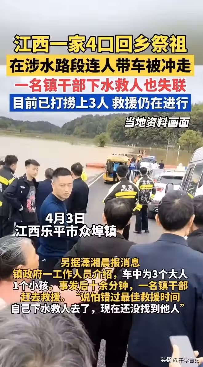 根據《ETtoday》報導,陸媒指出當時中國江西樂平市因連降暴雨,平均降雨量已達69.1毫米,不僅河流水位暴漲,暴雨也導致當地部分村莊道路、農田和居民小區被淹!上午一輛載著四個人的休旅車經過漫水路段,因為趕著回去祭祖,再加上,他們認為水沒那麼深,以車子的高度能夠過去,便想開車闖過去。