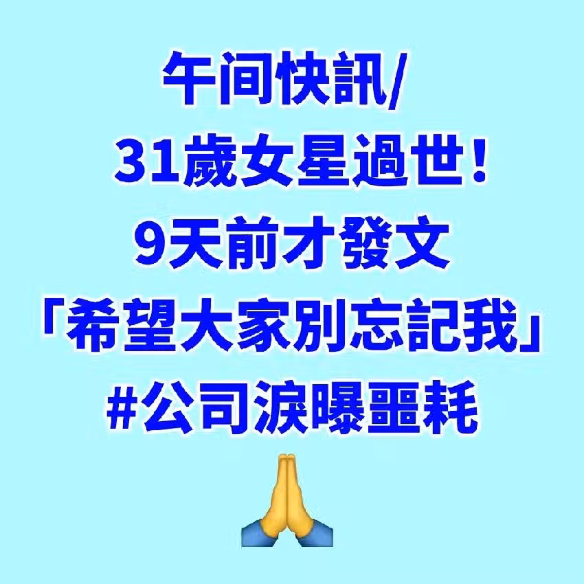 午間快訊/31歲女星過世!9天前才發文「希望大家別忘記我」!