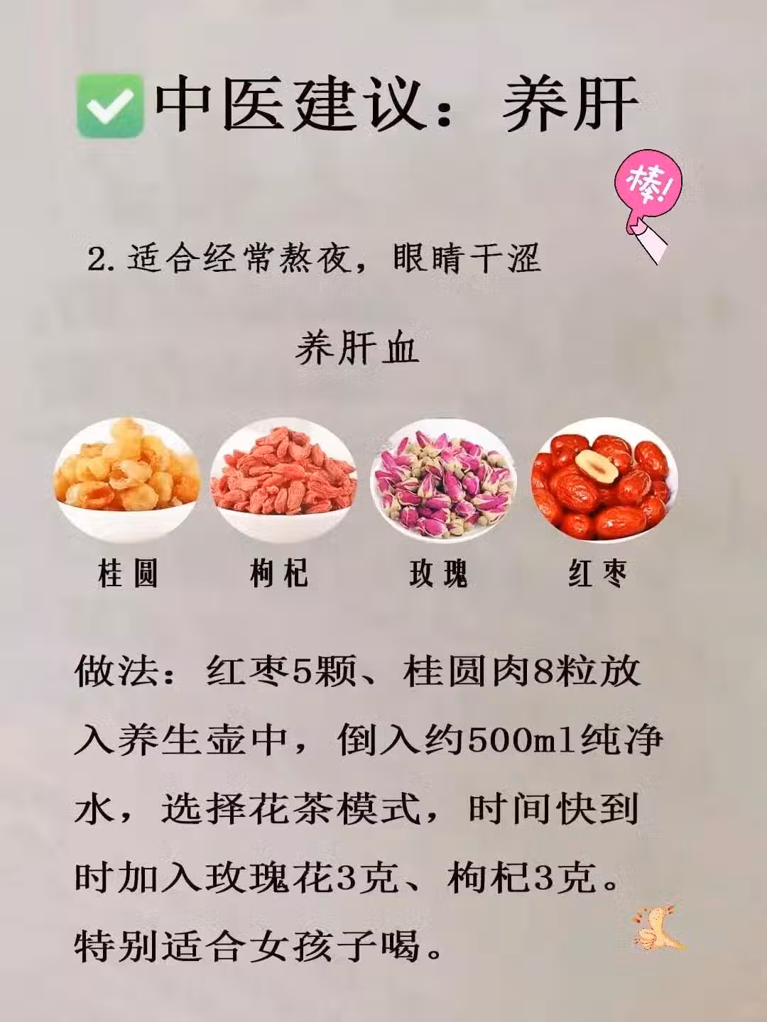 做法:金銀花、枸杞、菊花、決明子、山楂各適量,洗凈後放入養生壺,加水至標準水位線。選擇花茶模式烹煮15分鐘即可。此茶性涼,具有清熱降火、明目養肝之效,但脾胃虛寒者慎飲,以免引起不適。