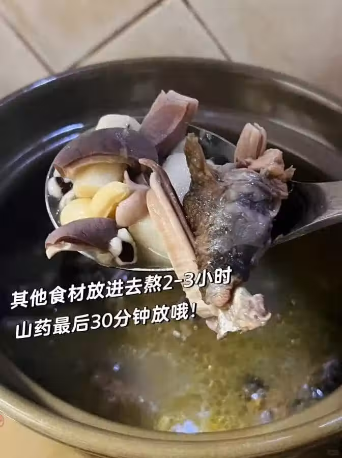 豬肚先入鍋30分鐘,燉到軟糯糯,再把雞肉和其他小夥伴一股腦兒丟進去,小火慢燉2-3小時。最後30分鐘,新鮮山藥閃亮登場!一碗金黃誘人的湯就出爐啦!😋