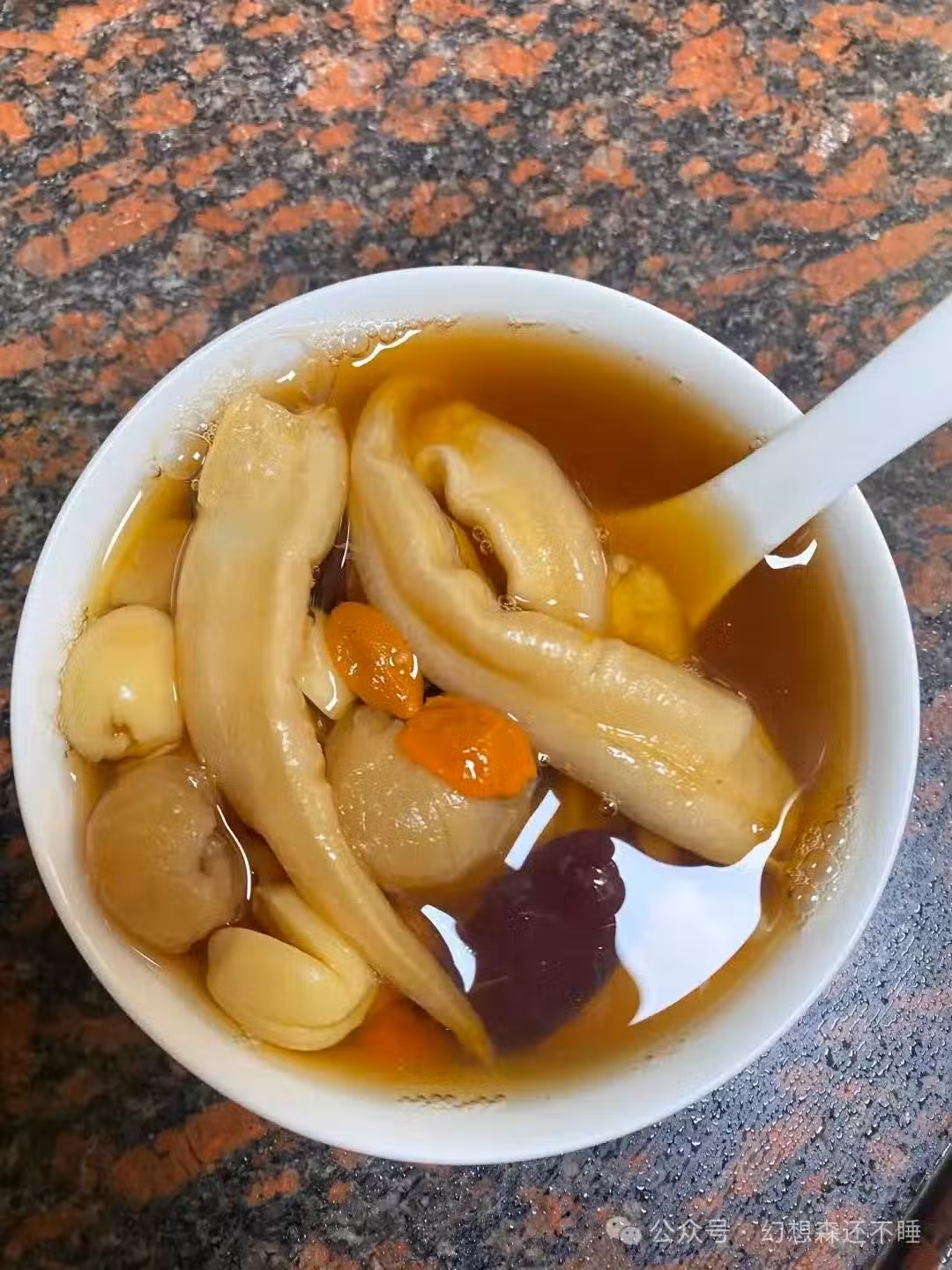 這個湯里加了魚膠,魚膠里的膠質超級豐富,特別適合美容養顏,這個湯就是一湯兩喝。
