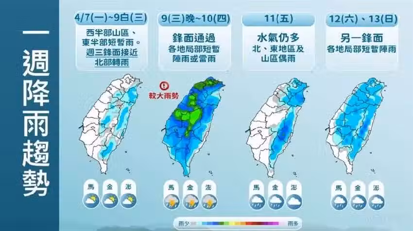 ▲周三(9日)晚起至周四(10日)本周第1波鋒面通過,中部以北地區有短暫雷陣雨,並有局部較大雨勢,其他地區亦有局部陣雨或雷雨。