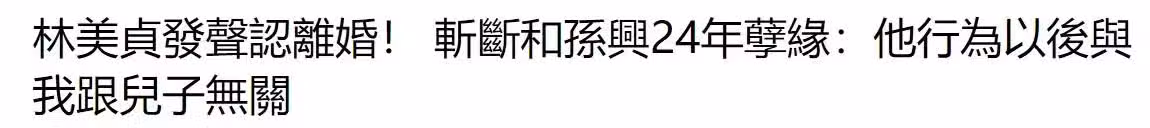 林美貞正式官宣與孫興離婚,夫妻徹底結束24年的婚姻關係。