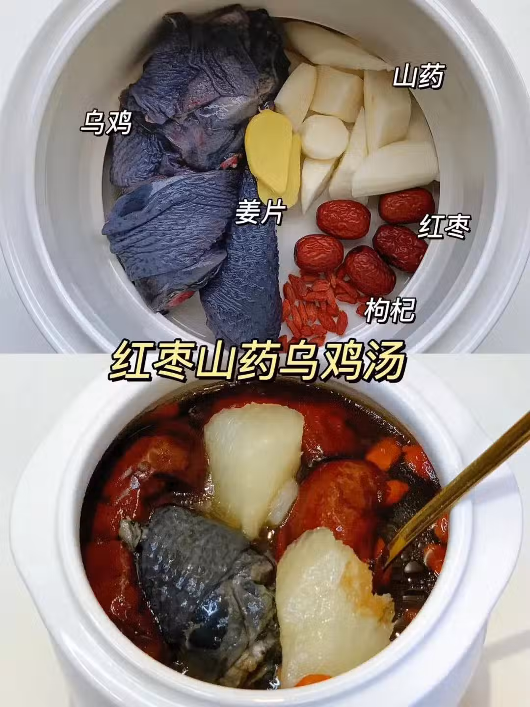烏雞和紅棗都含有豐富的鐵元素,有健脾固沖、滋陰補血的作用。山藥含有澱粉酶、多酚氧化酶等物質,有助於脾胃消化吸收功能。